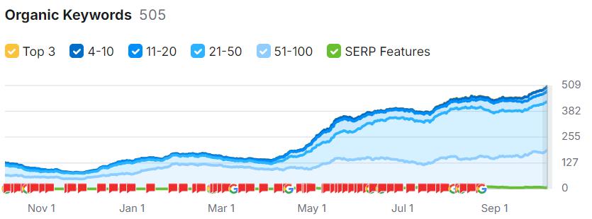We helped a Shopify brand increase their ranking keywords by over 230% - growing from 150 to more than 500 ranked keywords in less than a year.